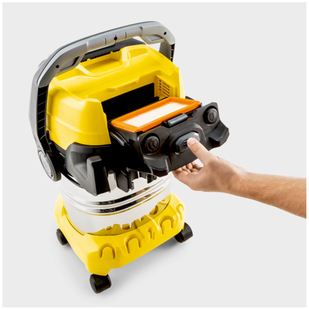 WD 5 S V-25/5/22 Islak Kuru Elektrikli Süpürge, iki kauçuk ve iki fırça şeritli zemin nozulu ve optimize emme hortumu her tür kirin en iyi şekilde süpürülmesini garanti eder ve maksimum temizlik rahatlığı sunar.1100 watt'lık bir güç tüketimi ile cihaz, 25 litrelik paslanmaz çelik bir hazne ve filtre kutusunu açarak düz plakalı filtreyi saniyeler içinde rahatça çıkarmanızı sağlayan yenilikçi filtre çıkarma teknolojisiyle donatılmıştır. Düz kıvrımlı filtre, filtreyi değiştirmek zorunda kalmadan kesintisiz ıslak ve kuru vakumlama için uygundur. Filtre temizleme düğmesine basarak, filtreyi temizleyebilir ve emiş gücünü eski haline getirebilirsiniz. Yerleştirme pozisyonu, basınçlı hava üfleme fonksiyonu, 3'ü 1 arada taşıma kolu ile kablo ve aksesuar saklama alanı gibi diğer kullanışlı özellikler cihazı tamamlayan özellikleridir. "Pull & Push" kilitleme sistemi, haznenin basit bir şekilde açılıp kapanmasını sağlar.