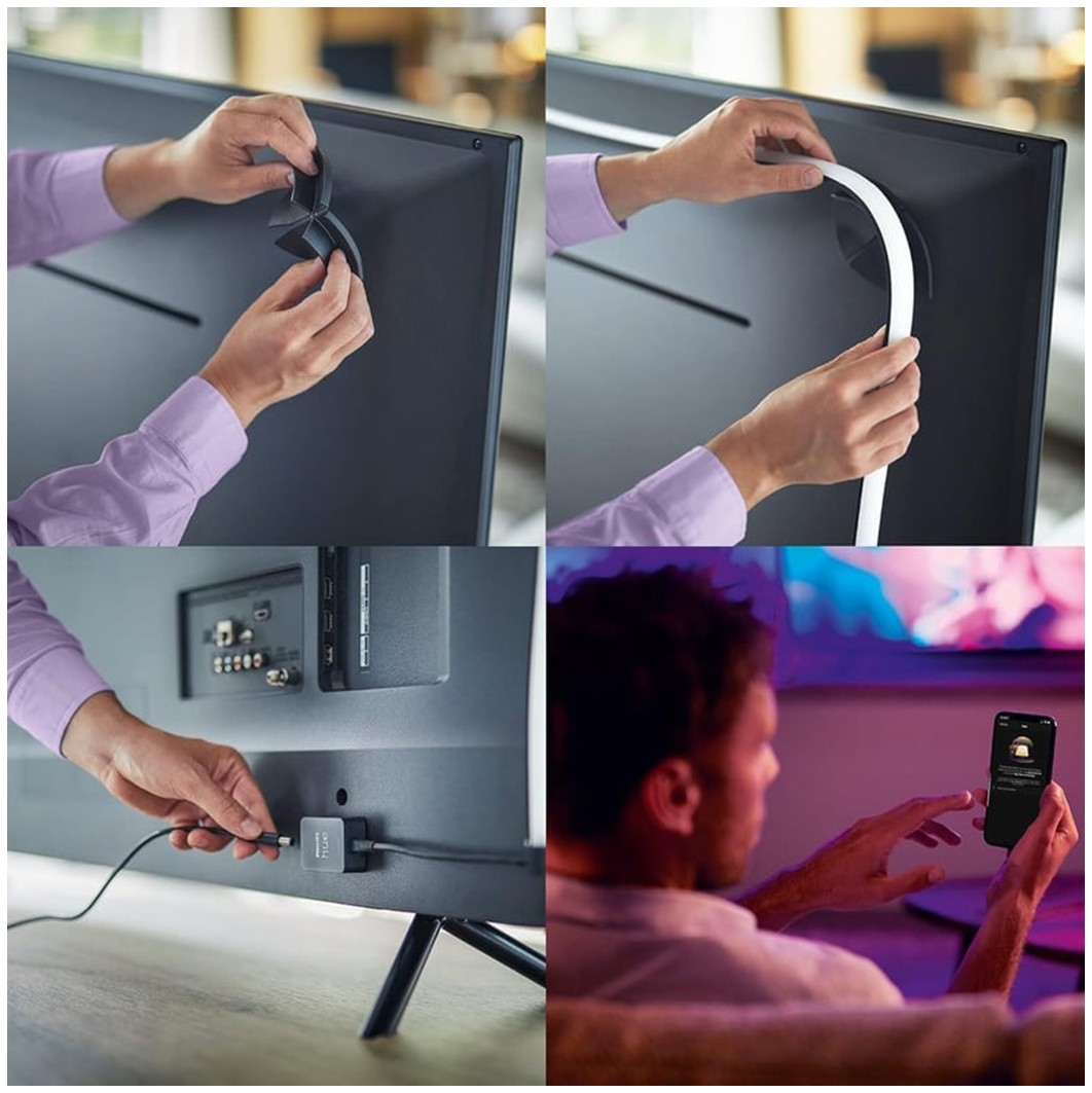 Philips Hue Play gradient lightstrip, televizyon eğlencesi için özel olarak tasarlanmıştır. LED şerit, 55 inç ve daha büyük televizyonlara uyan üç adet boyuta sahiptir ve kurulumu hızlı ve kolay hale getirmek için montaj braketleri içerir.