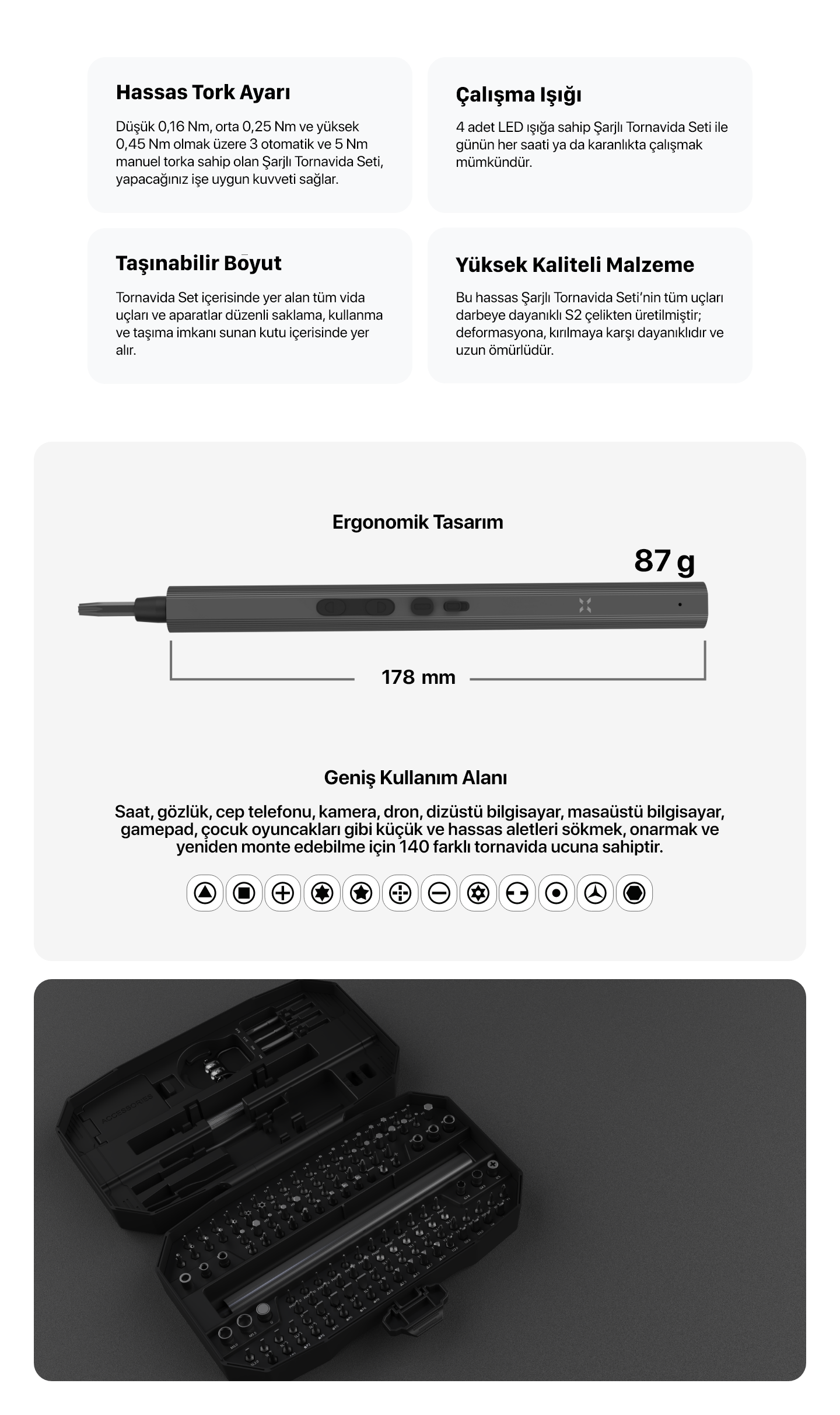 Xenon Smart Şarjlı Tornavida Seti; saat, gözlük, cep telefonu, kamera, dron, dizüstü bilgisayar, masaüstü bilgisayar, gamepad ve çocuk oyuncakları gibi küçük ve hassas aletleri sökmek, onarmak ve yeniden monte edebilmek için 140 farklı tornavida ucuna sahiptir.