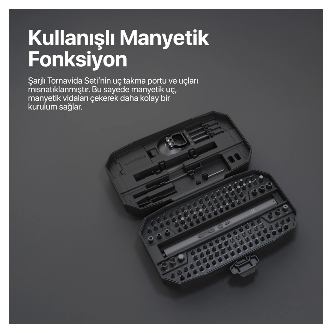 Tornavida gövdesi ve uç takma portu mıknatıslıdır, bu sayede hem uçlar güvenle tutulur hem de vidalar kolayca çekilerek kurulum hızlandırılır. Kutu içerisindeki Mıknatıslayıcı/Mıknatıs Giderici ile uçların manyetik özelliğini ihtiyacınıza göre ayarlayabilir, manyetik açma/kapatma tasarımlı kutusuyla seti güvenle saklayabilirsiniz.